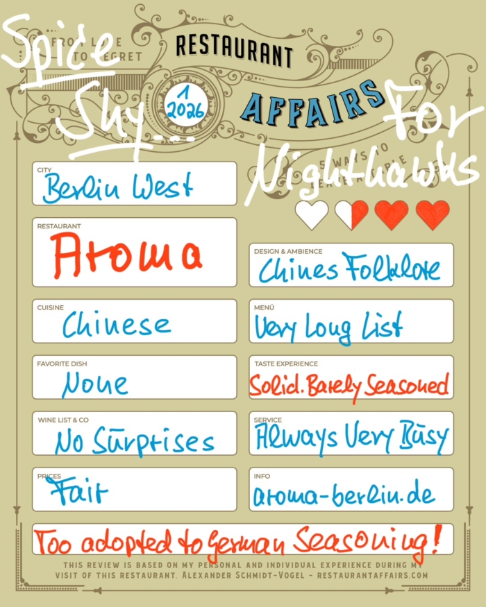In Little Asia on Berlin’s Kantstrasse the Chinese AROMA Restaurant is by far the oldest! Allegedly even 100 years old and most probably the first Chinese in Germany! So far so good.