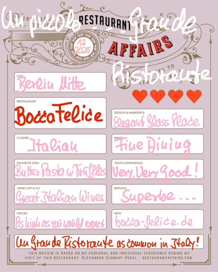 While the Bocca di Bacco I see as a bit sophisticated and cosmopolitan – the BOCCA FELICE comes across like A GRAND ITALIA in Milano or Torino.