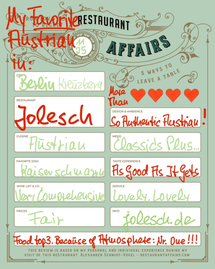 The Styrian Roman Salad, the Vienna Schnitzel, the Goose, the Kaiserschmarrn, the Wines – all so delicious! Easily one of the best three Austrians in Berlin. But because of the utterly authentic AUSTRIAN ATMOSPHERE: MY NUMBER ONE AUSTRIAN IN BERLIN ! | love it!