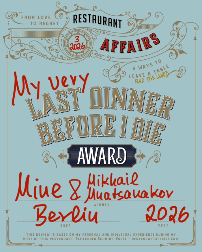 Long overdue – my very personal award to one of the very best restaurants, hosts and ambience in Berlin and absolutely competitive with the best in Europe: