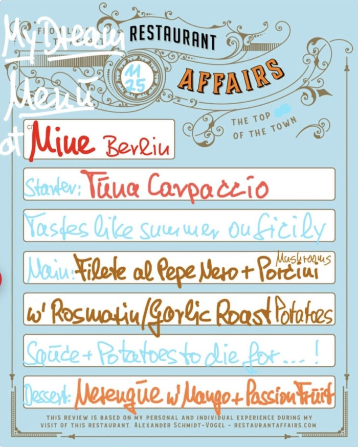 THE DESSERT: and finally the airy meringue with mango and passionfruit comes as a kind of PAVLOVA, which always reminds me of TAHITY BEACH in SAINT TROPEZ, the love of my life. SO ALL IN ALL: my evening at MINE was a trip to Sicily, to Tyrol in November and to Saint Tropez in May. What else can one ask for?