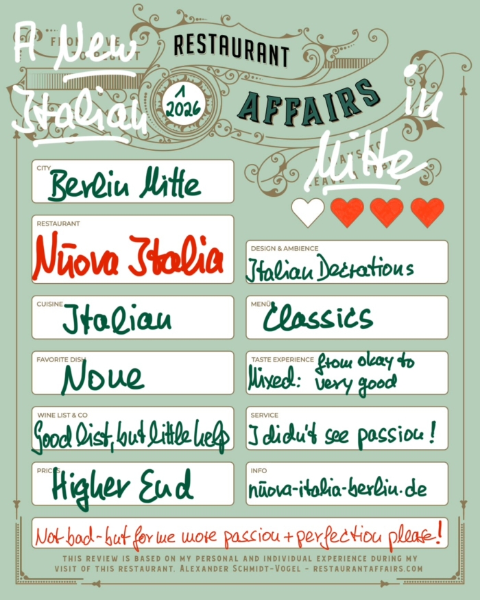 The NUOVA ITALIA opened 6 months ago in a part of Berlin Mitte which really needs good restaurants and as far as I know it’s very busy during lunch time and at least not empty on eves.