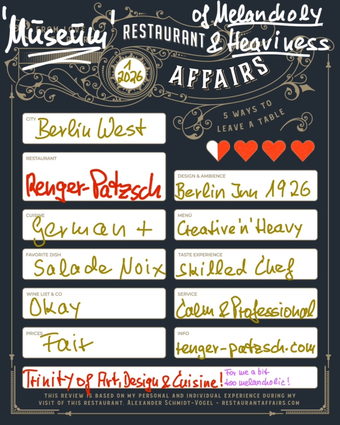 But the similarity of artwork, design of the place and style of cuisine forced herself on me: the sober black and white photos, the basic design of an inn like in 1926 – and the creative, professional and for me a bit heavy cuisine – that all comes as a kind of trinity of melancholy.