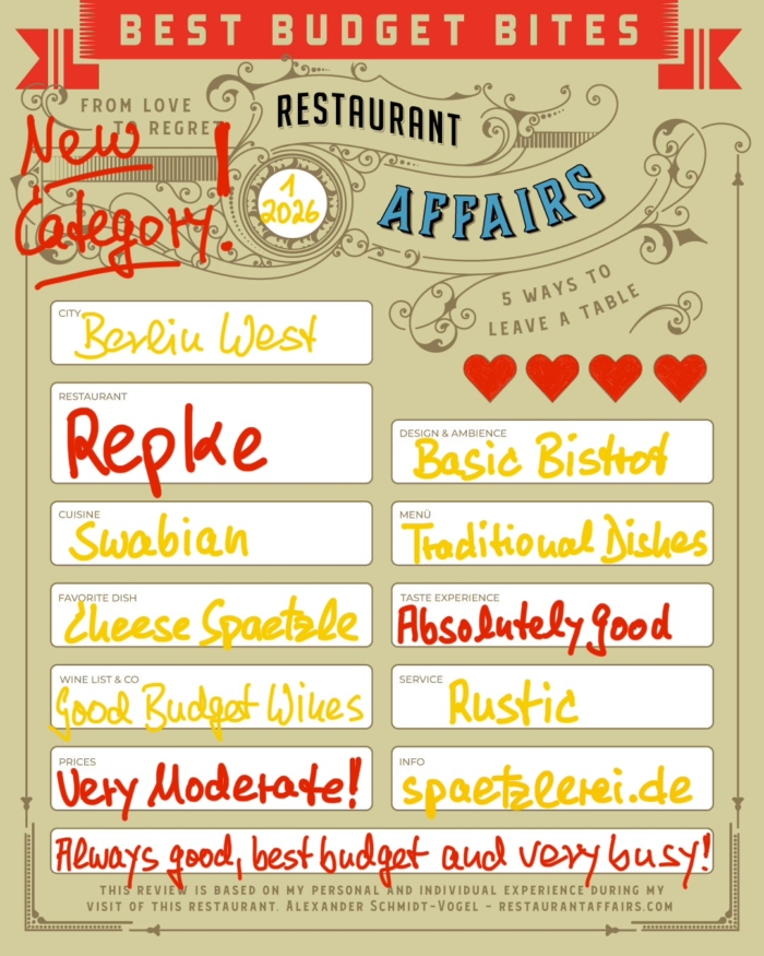 Impossible? Well, here we go! My brand new category: BEST BUDGET BITES. I start with REPKES SPAETZLEREI, a traditional Swabian eatery with many German classics, rich portions and yummy taste … at always very moderate prices … and correspondingly often very busy. In todays world a unique combination. And a very authentic place for German Dishes as well.