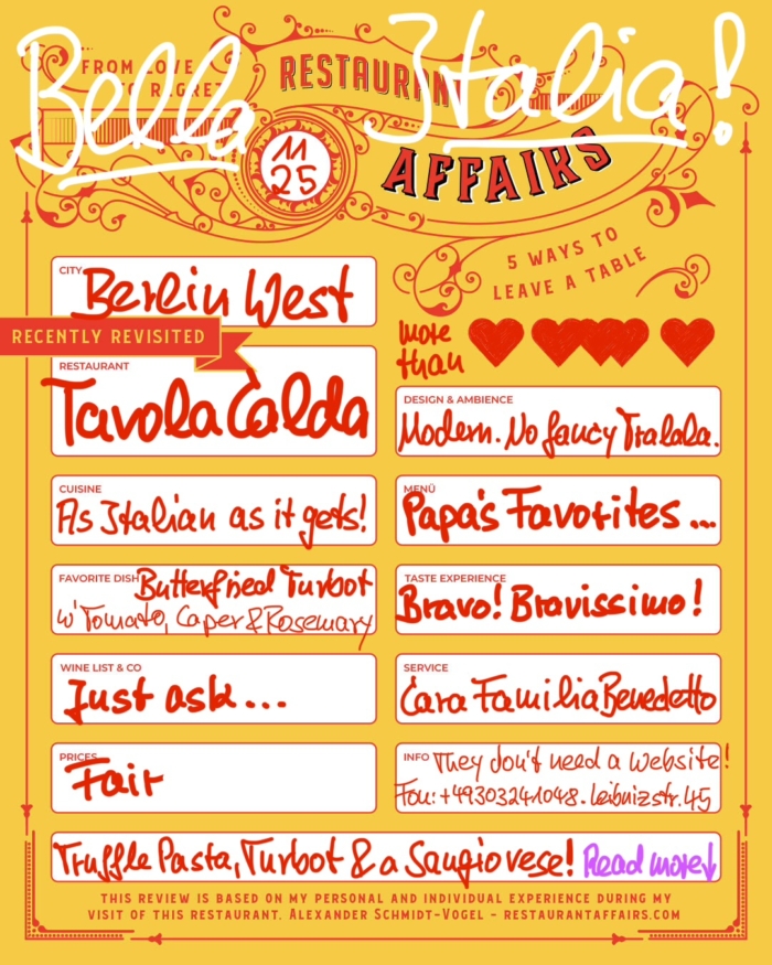 Don’t we food lovers always try to find the unfindable? A heavenly restaurant that just the insiders know? A hidden gem, busy every day – but not needing a website? Well known among the Berlin chefs – but not among tourists? And if I know such a place, should I tell it to you ??? ……. Okay, okay! Here we go: We’re happy guests at the Tavola Calda since 15 years: a small modern ristorante where Papa & Mama are cooking and both sons are doing their charming service. A few days ago I had a small portion of Taglierini in Butter Sauce and fresh Truffels on top, a crispy fried Turbot with Tomatoes, Caper & Rosemary …. and a mindblowing Sangiovese to lift me up into the Italian Heaven of TAVOLA CALDA.