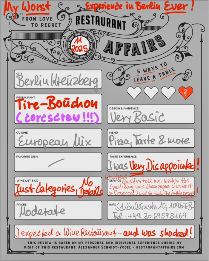 Since the menu just showed a few categories but no wineries and years, I tried to escape by asking wether they have Champagne, Cremant or Prosecco. The waitress tried to find out but could not check the bottle. So she brought the bottle and asked me to read the sparkling label … OMG !!! —